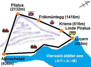 山頂への行き方はルツェルン駅からバス、ゴンドラ、ロープウェイを乗り継いで上る方法と、 アルプナッハシュタット駅から登山電車で一気に上る方法の通りがある。 両方乗ってみたいので行きと帰りでルートを変えることにした。