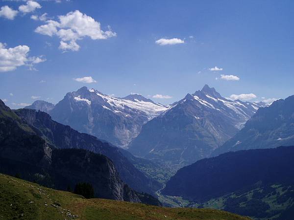 左:アイガー[Eiger](3970m)、中央:メンヒ[Mönch](4099m)、右:ユングフラウ[Jungfrau](4158m)