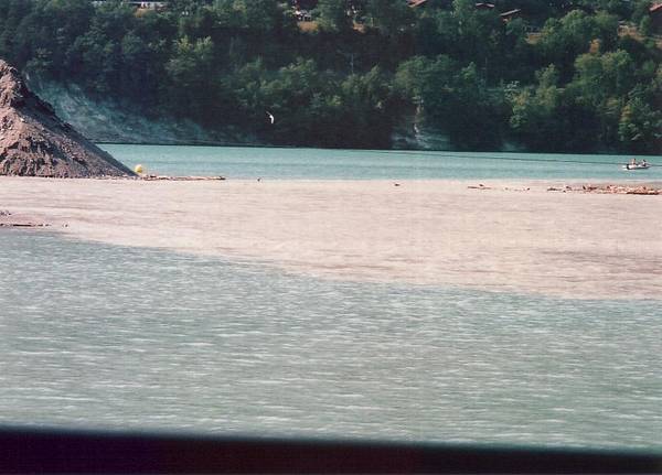 ベーニゲン[Bönigen]に着いたとき、川からの水が流れ込む場所が乳白色になっている。 氷河を含んだ水グレッチャーミルヒ[Gletschermilch]らしい。 レマン湖の深い青と違って、トゥーン湖やブリエンツ湖がエメラルドグリーンに見えるのはそのせいかも。