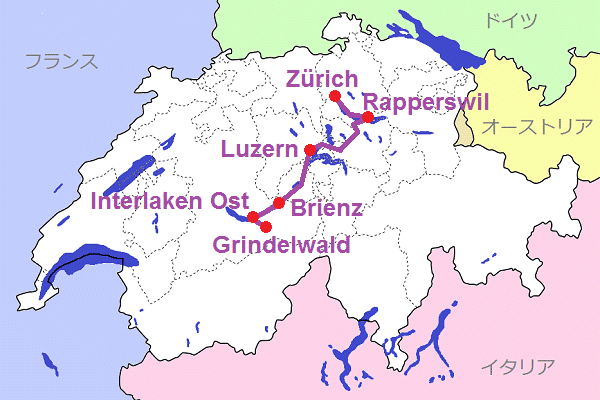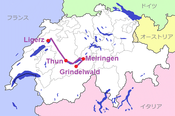 | 8/8(金) | チューリヒ湖遊覧船、ラッパーズヴィール②、ブリエンツ湖遊覧船③ | グリンデルワルト④ |