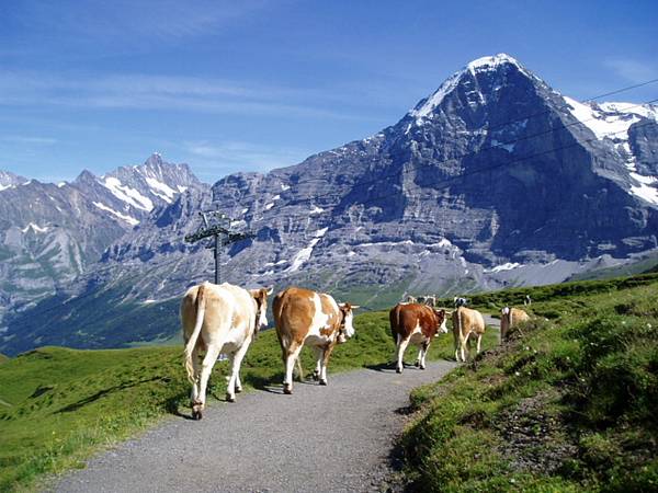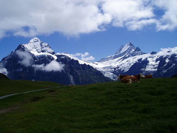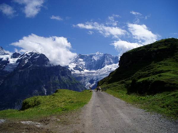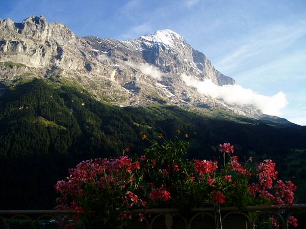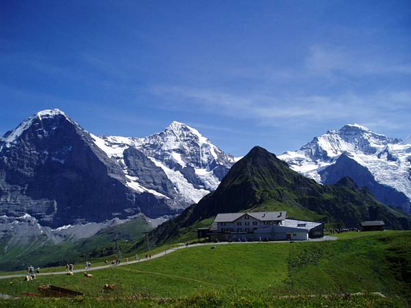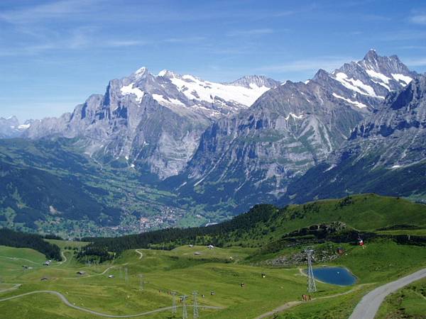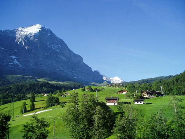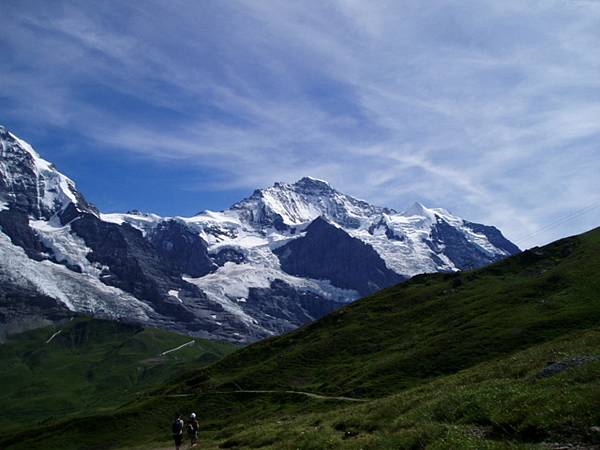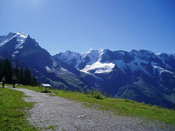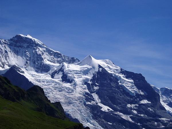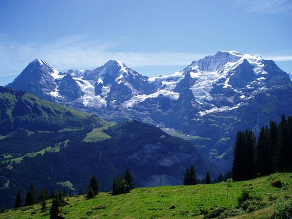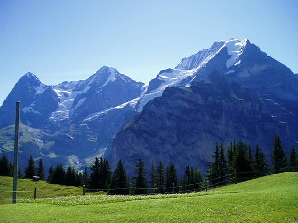 左からアイガー[Eiger](3970m)、メンヒ[Mönch](4099m)、ユングフラウ[Jungfrau](4158m)とユングフラウ三山がどっしりとそびえ立つ。