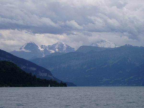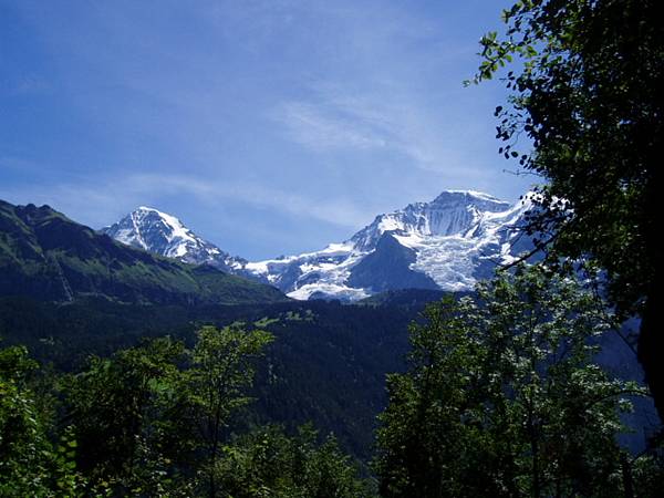 シュピーツを過ぎた頃から、ユングフラウ3山が見え始めた。 左から、アイガー[Eiger](3970m)、メンヒ[Mönch](4099m)、ユングフラウ[Jungfrau](4158m)。