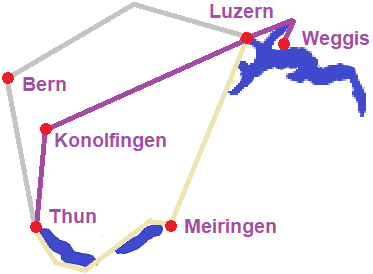 ゴールデンパスラインと言われる眺めの良いマイリンゲン[Meiringen]経由(地図のベージュ色の線)ではなく、 平地を回り込む最速ルートのベルン[Bern]経由(地図のグレーの線)でもなく、マイナーなコノルフィンゲン経由で行くことにした。