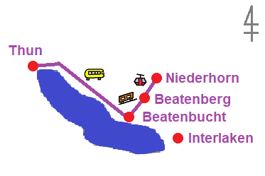 トゥーンからトゥーン湖沿いを走る1番バスでベアテンベルク行き、ケーブルカー乗り場のあるバス停ベアテンブフトへ。 更に、ケーブルカーとゴンドラを乗り継いでニーダーホルンへ。